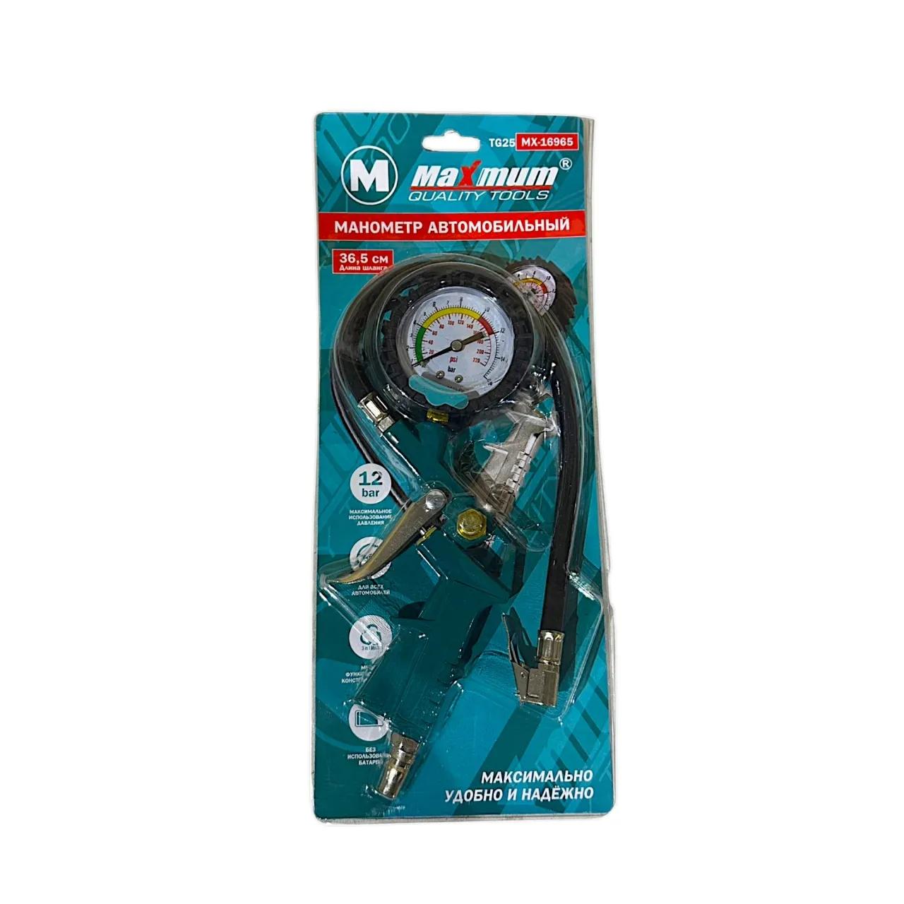 Пистолет с манометром предназначен для измерения давления и подкачки шин. Пневматический пистолет оснащен кнопкой стравливания воздуха и манометром с двойной шкалой, что дает возможность контролировать давление в шинах во время подкачки. Гибкий шланг 36,5 см позволяет производить работы в узких и труднодоступных местах. Легкий алюминиевый корпус прорезинен. Шланг 15 атмосфер и соединение типа рапид созданы для быстрого и удобного подключения.