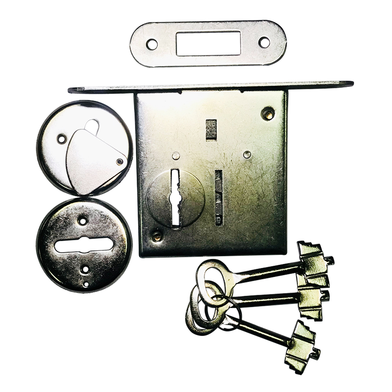 Комплектация: врезной замок, запорная пластина, накладки на замочную скважину — 2 шт, шурупы 8 шт, 3 ключа.